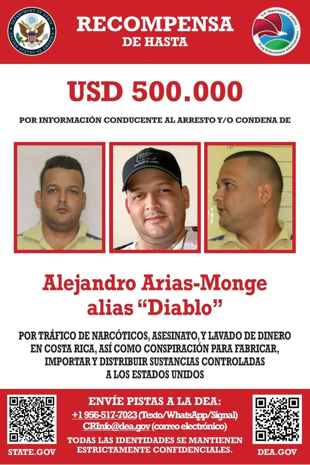 El fiscal general de la República, Carlo Díaz Sánchez, confirmó que este miércoles se logró que el Programa de Recompensas contra el Crimen Organizado Transnacional del Departamento de Estado de los Estados Unidos ofrezca hasta $500.000 por la ubicación de Alejandro Arias Monge alias “Diablo”.