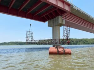 guindolas-andamio, en la parte exterior del puente, con la